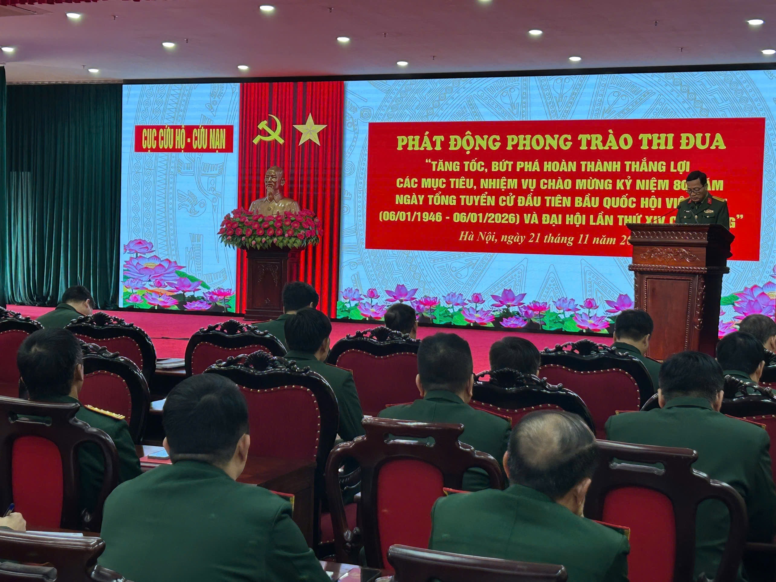 Ngày 21/11, tại Hà Nội, Cục Cứu hộ – Cứu nạn/Bộ Tổng Tham mưu tổ chức Lễ phát động đợt thi đua cao điểm với chủ đề “Tăng tốc, bứt phá hoàn thành thắng lợi các mục tiêu, nhiệm vụ Nghị quyết Đại hội lần thứ XIII của Đảng, lập thành tích chào mừng kỷ niệm 80 năm Ngày Tổng tuyển cử đầu tiên bầu Quốc hội Việt Nam (06/01/1946 - 06/01/2026) và Đại hội lần thứ XIV của Đảng”, nhằm tạo động lực mới trong toàn Cục, phấn đấu hoàn thành xuất sắc nhiệm vụ năm 2025 và lập thành tích thiết thực chào mừng các ngày lễ lớn của Đảng, Nhà nước, Quân đội. Buổi lễ diễn ra theo đúng nghi thức quân đội, khí thế thi đua sôi nổi, đoàn kết, quyết tâm cao.